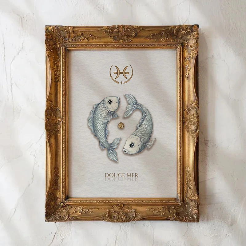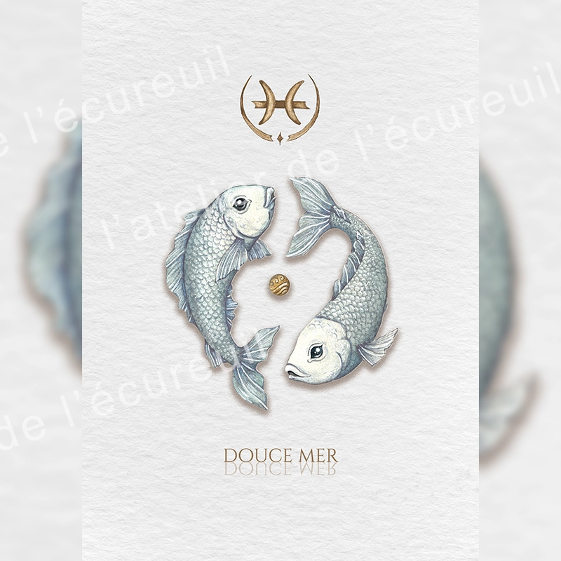 Vous connaissez peut-être déjà la version carte vintage, riche en symboles et en détails dorés. Celle-ci, c’est son alter ego apaisé : même univers, même âme — mais distillés à l’essentiel. Deux poissons entrelacés, le symbole du natif, un fond épuré. Rien de superflu, tout en intention. Une illustration qui s’efface pour mieux laisser parler ce qu’elle représente.