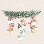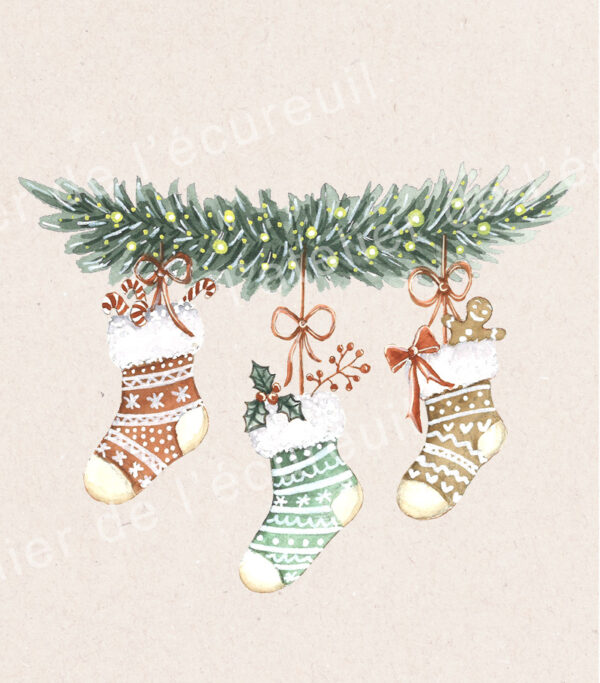 Trois chaussettes de Noël suspendues à une branche de sapin, disponibles avec ou sans enveloppe pour des vœux tout en douceur.
