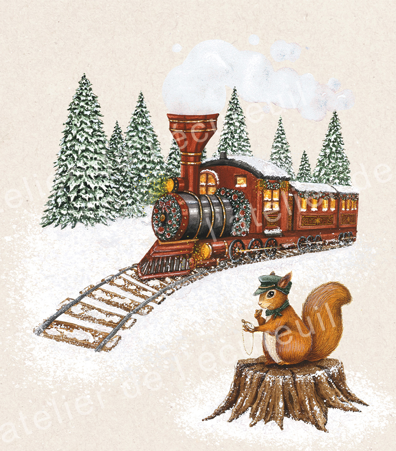 Dans cette scène hivernale, un train rouge décoré de guirlandes et de couronnes traverse une forêt enneigée, illuminant la neige de ses fenêtres chaleureuses. Sur une souche, un petit écureuil en tenue de chef de gare, montre gousset en main, attend avec impatience l’arrivée du train.